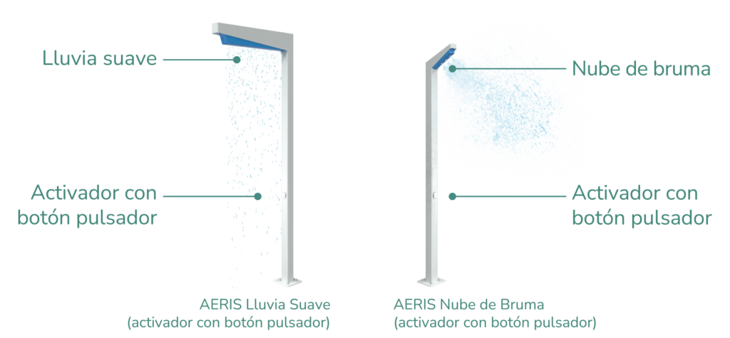 Aeris Lluvia Suave ofrece un refresco inmediato mediante gotas suaves activadas con un botón. Su diseño minimalista y elegante se integra a la perfección en espacios urbanos y funciona de forma fiable incluso en zonas con agua dura.