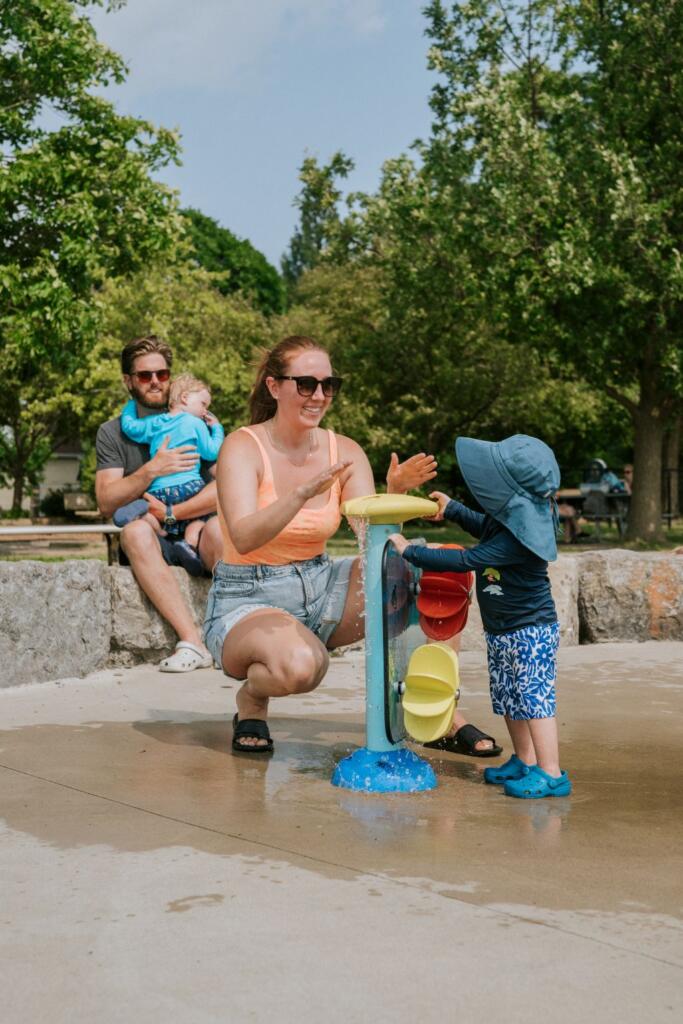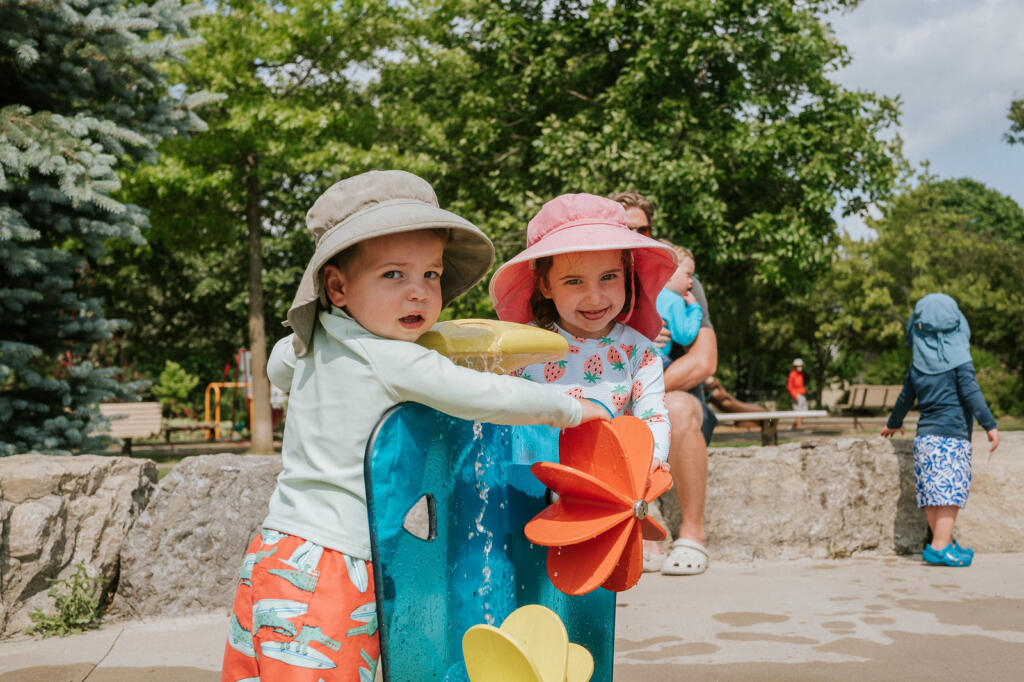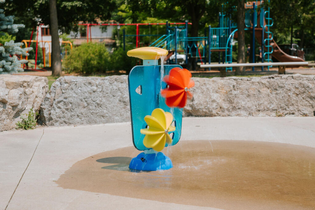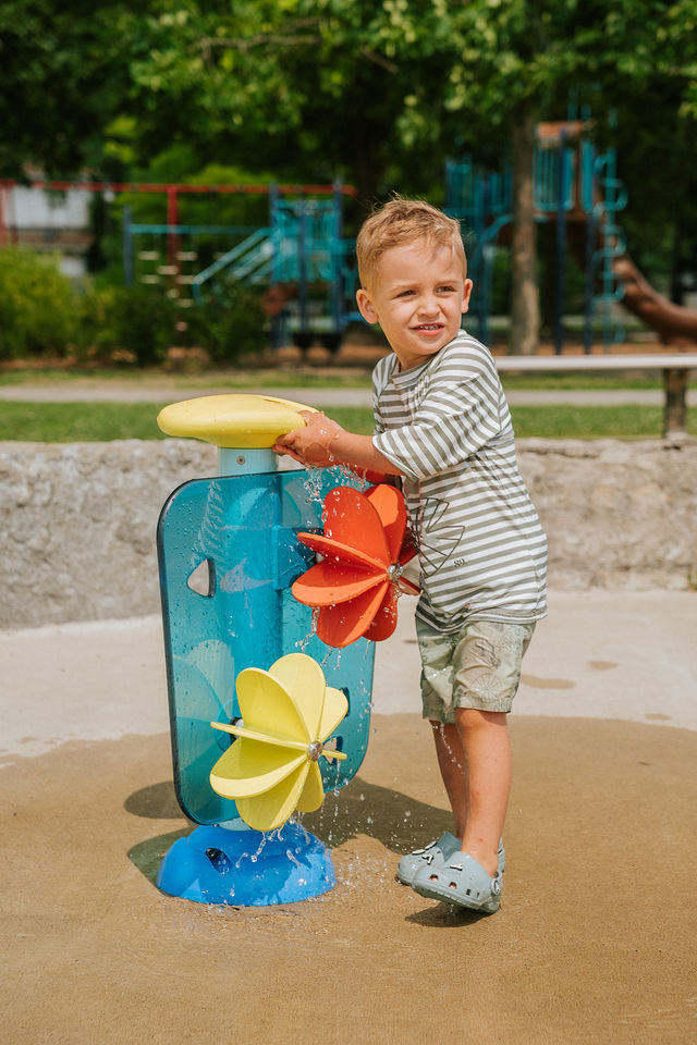 - Un flux d’eau doux et des roues tournantes initient les tout-petits au jeu aquatique en toute sécurité.