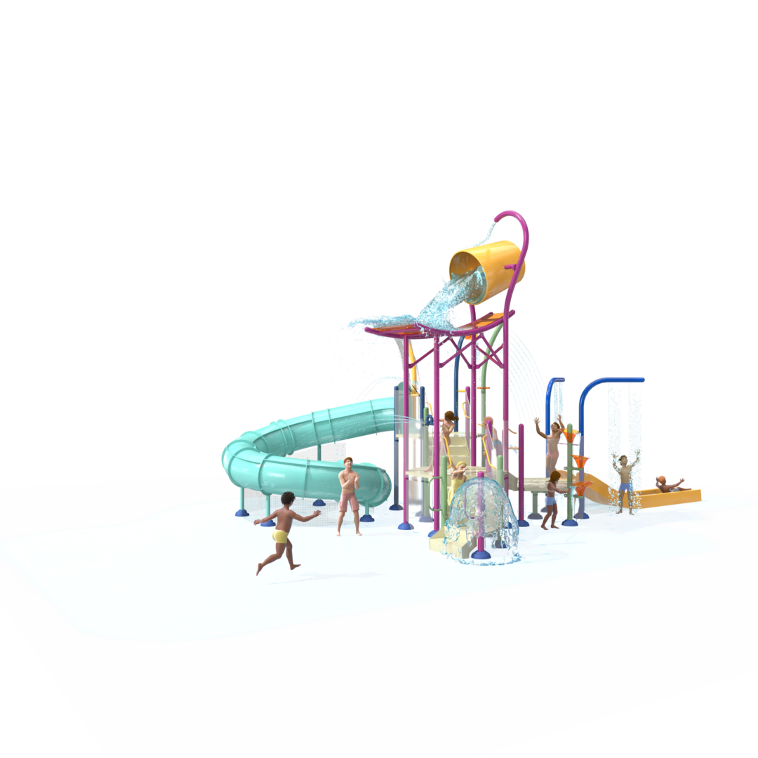 ElevationsMC L4-38420: Structure de jeu aquatique modulaire offrant une expérience de jeu dynamique. Les canons à eau règnent en hauteur tandis qu’un toboggan en spirale à 360° ajoute une touche d’aventure.