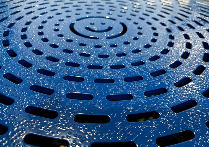 Drain Playsafe No4 : Nouveau design de couvercle de 22 po de diamètre. Tuyau de drainage de 6 po de diamètre. 3 ancrages de nivellement réglables.