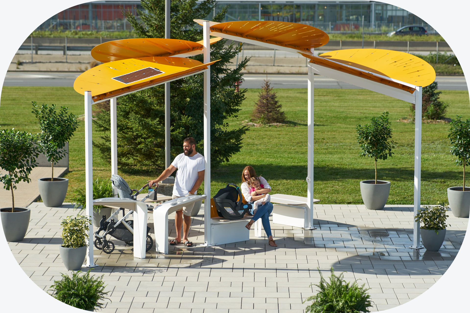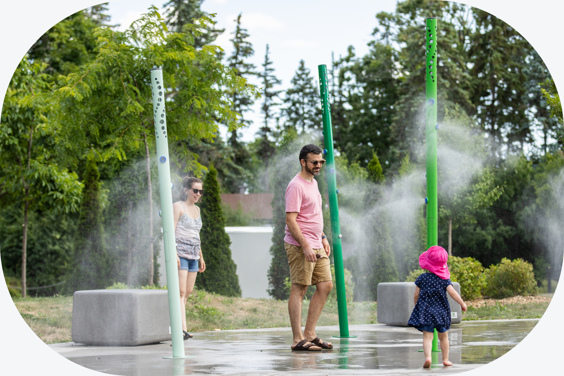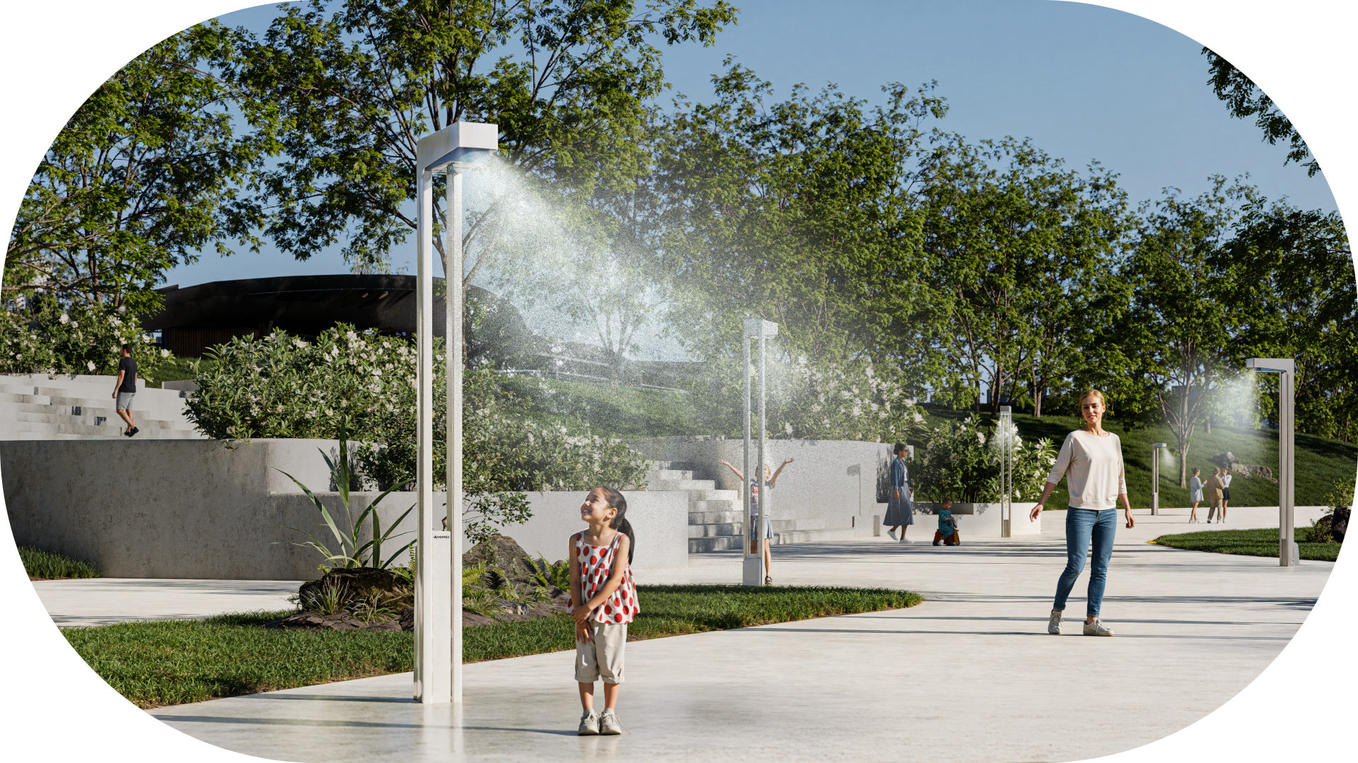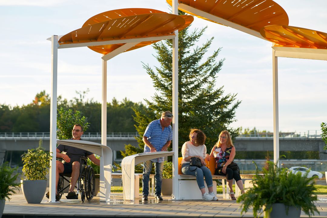 Designed to be inclusive, our Abrio, Glomist, and Aeris solutions provide a refreshing space, day or night, to all citizens – whether it’s to take a break during a busy day, play with loved ones or seek relief from the heat.