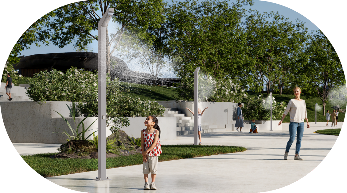 Aeris brings elegant, minimal cooling structures designed to make cities more livable in the face of rising heat. Delivering gentle mist and soft water experiences, Aeris solutions blend seamlessly into pathways, plazas, and public spaces, bringing inclusive, accessible comfort to everyone.